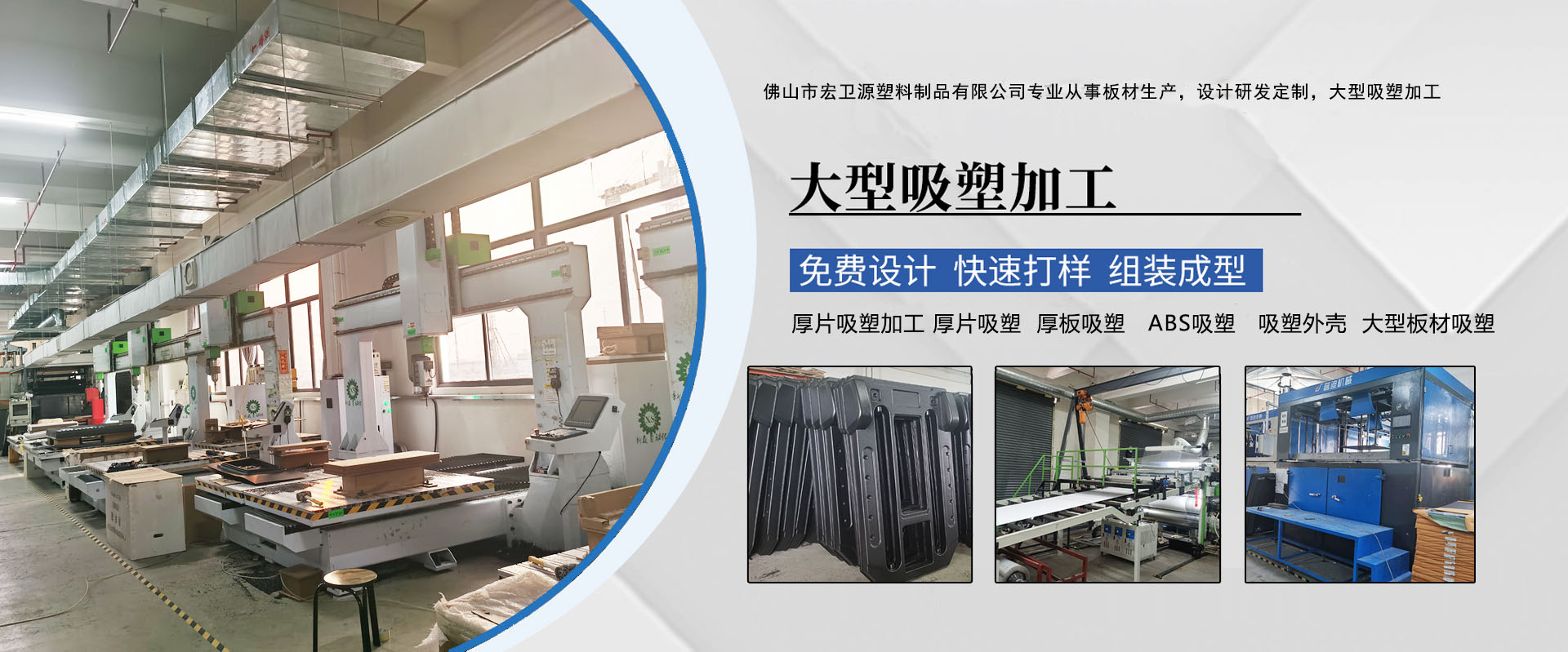 佛山市宏衛源塑料制品有限公司(原東莞市宏衛展示用品有限公司)成立于2007年,是集研發,設計,生產,服務為一體的專業吸塑加工廠,生產各種厚片吸塑,大型吸塑,亞克力制作等產品的現代化企業。從原料顆粒到厚片板材-鋁模制作-吸塑成型-五軸/三軸CNC加工-手板粘接打磨-組裝-噴油絲印-包裝出口等一條龍服務。本公司配備厚片吸塑機11臺(4000*2000*800 )、5軸數控中心9臺,平面CNC多臺 、亞克力激光機、分割機 、折灣機等先進生產設備,確保了樣品制作和批量生產的精度和進度。